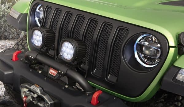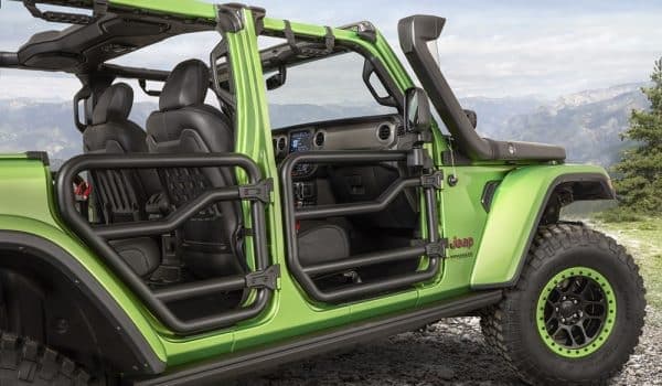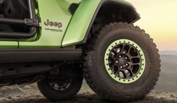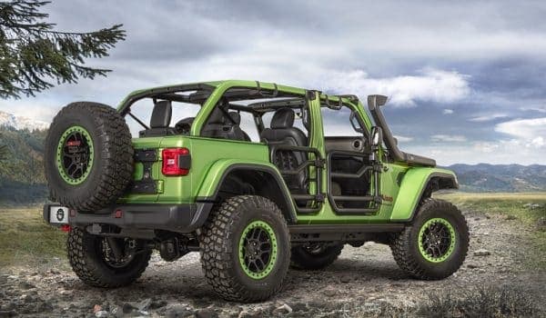 Sobre la base del acabado Rubicon, esta unidad rematada en colo verde lima viene equipada con un nuevo capó, gráficos Moab en la carrocería, protectores de aluminio en las puertas, iluminación LED adicional, asas de sujeción, alfombrillas específicas, paragolpes de nueva factura, asientos de cuero y ruedas de 17 pulgadas con neumáticos todoterreno BFGoodrich de 35 pulgadas, entre muchos otros. Todo ello estará disponible en el catálogo de Jeep Performance Parts.