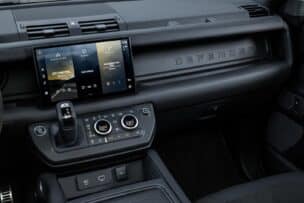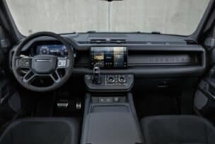 Por dentro, el Defender V8 tiene los asientos revestidos en exclusiva piel Windsor y Miko Suecloth en color Ebony con detalles de Robustec y todos están acabados con una exclusiva etiqueta en Ebony, mientras que el travesaño del Defender que queda a la vista presenta un acabado especial con pintura electrostática en Satin Black. El volante de cuatro radios se ha mejorado con recubrimiento de Alcantara y unas levas de cambio táctiles con un acabado cromado satinado que son exclusivas de los modelos V8. La cubierta del airbag y la palanca de cambios están revestidas de piel, y los estribos iluminados están terminados con la inscripción V8.