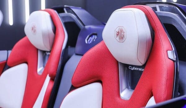 Los asientos «Zero Gravity» de MG tienen reposacabezas flotantes, mientras que los paneles de las puertas y las manillas de cuero rojo reflejan el «cinturón láser» que recorre el exterior del automóvil.