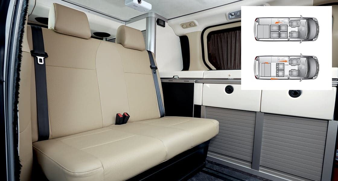 Las versiones camper reciben las modificaciones habituales en este tipo de vehículos, incluido el techo retráctil que esconde una cama doble. También se ha incluido una práctica cocina, una nevera y fregadero, depósito de agua, calefacción independiente, mesa plegable, varios armarios y cajones porta-objetos, etc.