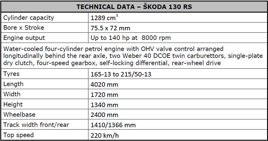 El Škoda 130 RS es considerado un destacado representante de los 114 años de tradición en las carreras de la marca checa. Cuando este modelo vio la luz se enfrentó a un doble desafío. Por un lado tenía a los duros competidores del resto de Europa y por el otro, los checos debían desarrollar un coche de carreras en la antigua Checoslovaquia comunista, lo que ya era una hazaña.