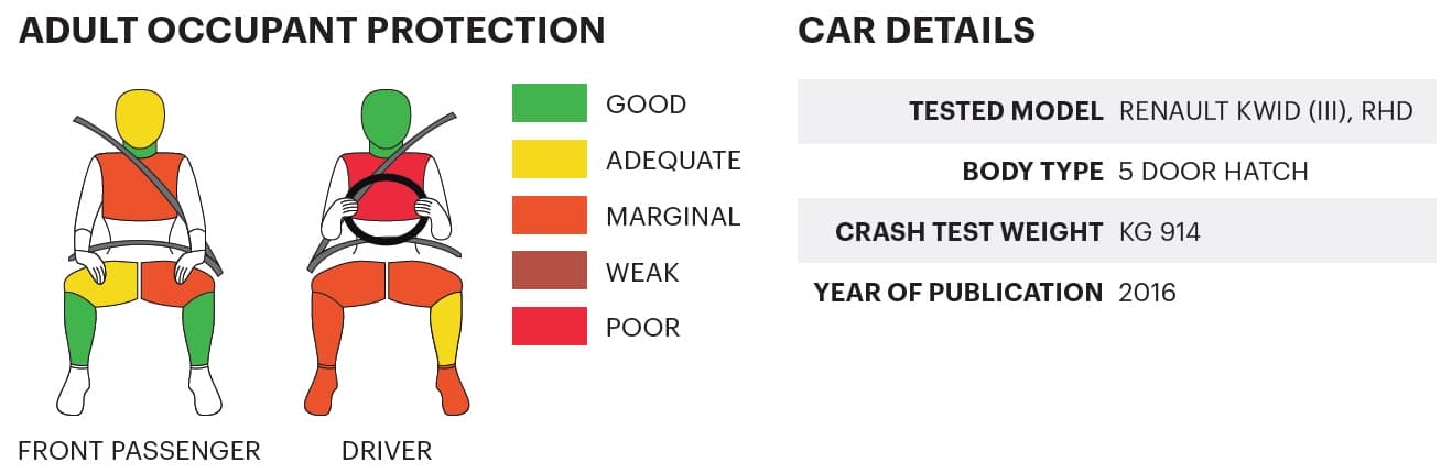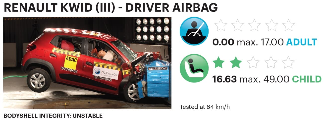 La protección infantil tampoco brilló aunque con dos estrellas está al nivel de otros productos del mismo segmento comercializados en la India, como el Hyundai Eon. El equipamiento de seguridad del Kwid es prácticamente nulo, sin ABS, EBD y por supuesto tampoco múltiples airbags o controles de tracción/estabilidad.