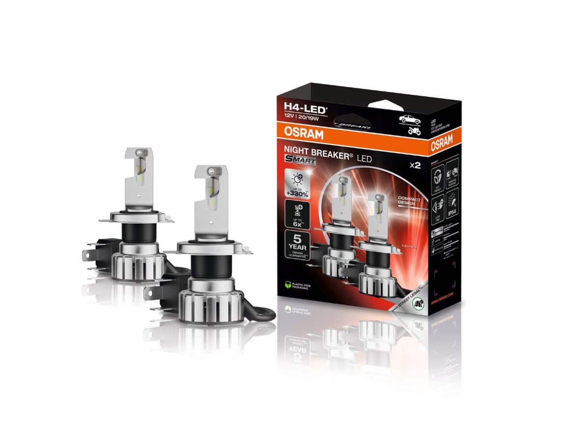 OSRAM NIGHT BREAKER® LED SMART es un sustituto de las lámparas de los tipos más populares, H4 y H7, por lo que es adecuado para una amplia gama de tipos de vehículos – desde coches y autocaravanas hasta motocicletas.