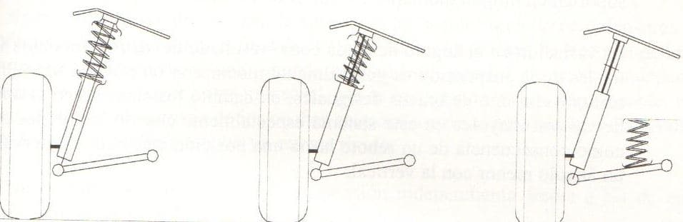 Dentro de esta suspensión, podemos encontrar diferentes configuraciones dependiendo de las necesidades de los fabricantes, entre ellas, podemos encontrar un diseño con el puntal del amortiguador invertido, otro con la composición amortiguador-muelle formando un cierto ángulo dependiendo del diseño y una configuración final, que consiste en el que el amortiguador no está encerrado en el muelle.