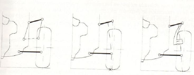 4) El ángulo de caída del neumático es menor en la configuración Mac Pherson que en la de brazos desiguales. Sin embargo, los cambios en el ancho de vía son mayores sobre todo cuando las ruedas caen después de un rebote hacia su punto más bajo, por lo que al final conserva un ángulo menor con respecto a la vertical.
