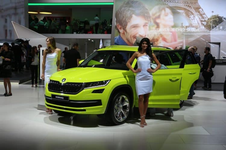 Algo que nos ha sorprendido del nuevo Kodiaq en París es su oferta de colores que incluye desde tonos muy convencionales y sobrios hasta el llamativo amarillo-verde que puedes ver en las imágenes y que parece está promocionando el tour de Francia (faltan las pegatinas).