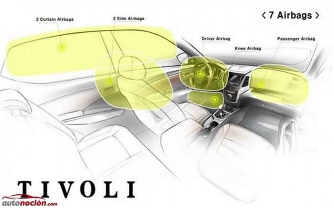 Según la marca, el Tivoli garantiza la seguridad de los pasajeros mediante la aplicación de la última tecnología y una gran cantidad de materiales de alta resistencia que vendrán acompañados por 7 airbags, incluyendo un airbag de rodilla para el conductor y un sistema de cinturón de seguridad avanzado con doble pretensor que tensa automáticamente y de manera más eficaz el cinturón para sujetar a los pasajeros y minimizar las lesiones.