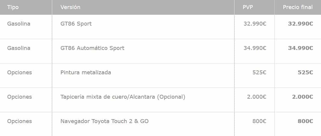 El Toyota GT86 2017 ya está disponible en la Red Oficial de Concesionarios de Toyota España, desde 32.990 € o 386 € al mes con Pay per Drive, la fórmula de pago por uso de Toyota España. Más abajo os dejamos todos precios del Toyota GT86.