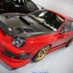 La verdad es que a este Impreza no le falta ni un solo detalle, desde su pintura color rojo que pertenece nada menos que al catálogo de Ferrari, un sistema hidráulico capaz de levantar el coche en segundos, múltiples elementos acabados en fibra de carbono, un prominente alerón trasero o el capó personalizado. Además luce un juego de llantas «Volk TE37» perfectas para poner la guinda al pastel en su exterior, en ese color dorado que crean un contraste con su pintura roja ‘made in‘ Ferrari.