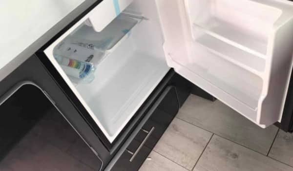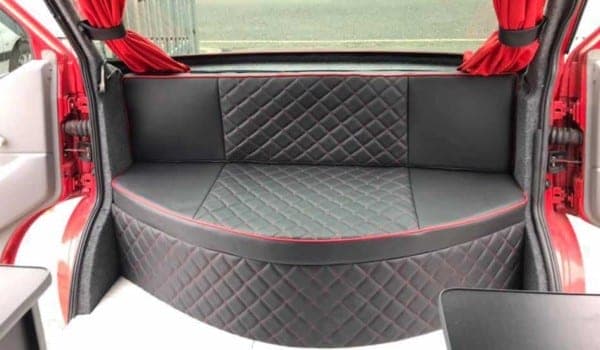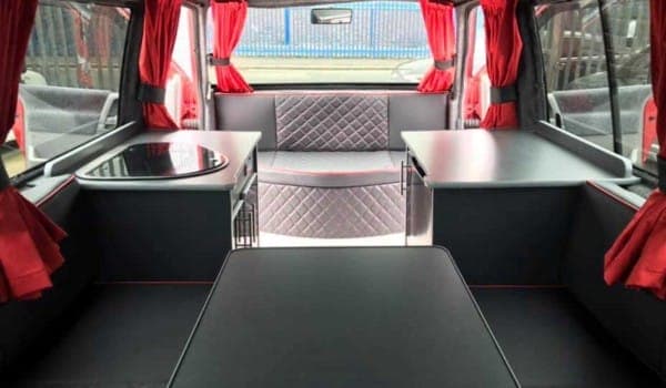 Se mantienen reales las puertas de acceso al vehículo, al menos las delanteras, pero todo el habitáculo original ha sido sustituido por nuevos elementos que buscan maximizar el espacio. Ahora hay una gran sala de estar alrededor de una mesa, con un área de cocina que incluye quemador de gas, fregadero de acero inoxidable y refrigerador.