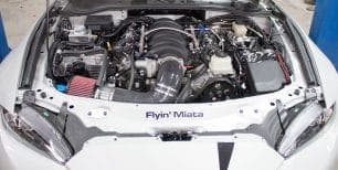 Como resultado de esta modificación el peso del vehículo asciende hasta 113 kilos extra, pero Flyin’ Miata ha asegurado que ha trabajado duro para conservar la conducción y el carácter innato de este roadster sin convertirlo en un monstruo incontrolable. La distribución del peso se mantiene prácticamente intacta, con un 53:47 entre la parte delantera y trasera frente al 52:48 del modelo de serie.