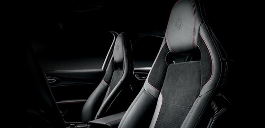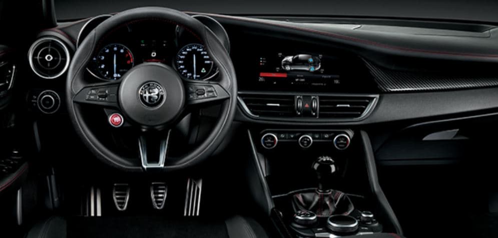 Los interiores, realizados con materiales extraordinarios, rebosan de detalles. El salpicadero del Giulia Quadrifoglio es de piel, enriquecido con detalles de carbono. Los asientos deportivos, revestidos en Alcántara y piel, destacan por sus costuras en contraste. El volante deportivo de reducido diámetro está revestido en piel y aloja el botón Rojo Alfa de arranque.