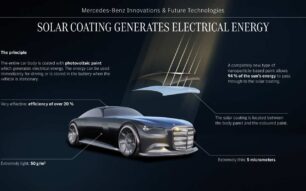 Mercedes-Benz investiga un recubrimiento solar fotovoltaico capaz de generar energía incluso cuando el vehículo está apagado. Este innovador material, sin silicio ni tierras raras, puede aumentar la autonomía anual hasta en 12.000 km bajo condiciones ideales.