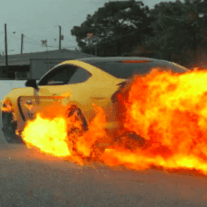 Al parecer este modelo incorporaba diversas modificaciones que no eran de fábrica, y en un momento determinado un fallo en el motor provocó un derrame de aceite que al entrar en contacto con algún elemento demasiado caliente empezó a arder convirtiendo este pony car en una auténtica bola de fuego sobre ruedas.