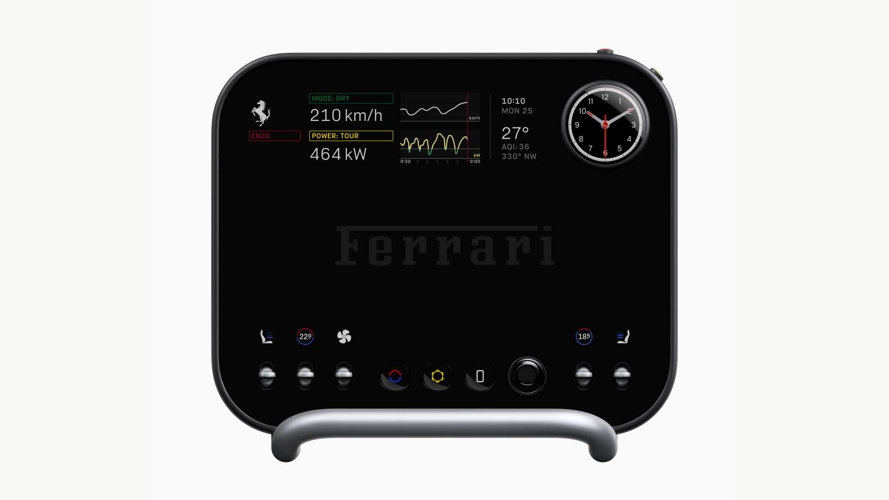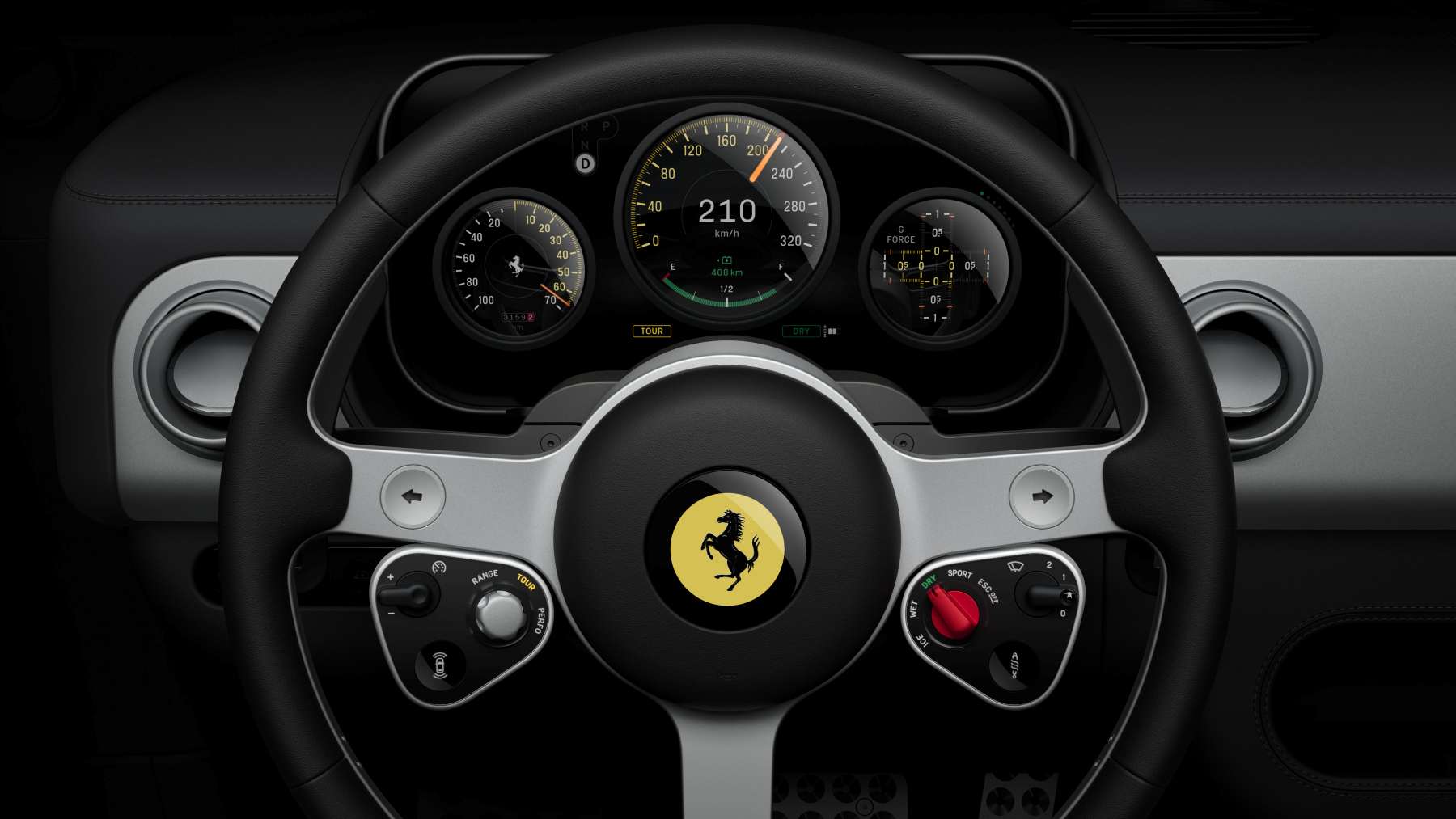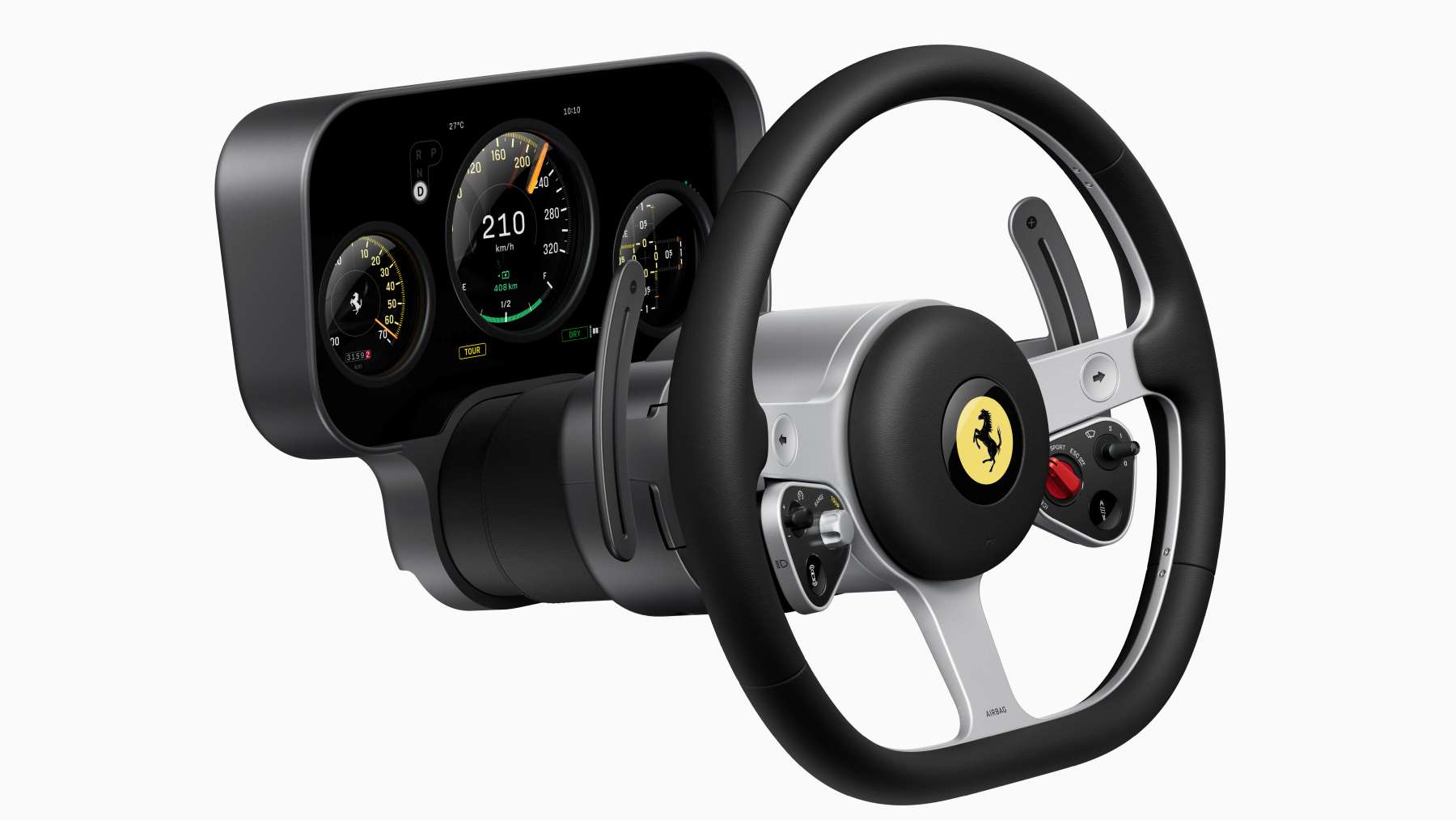 El interior del Ferrari Luce se entiende rápido: todo está ahí para conducir, no para distraer ni para presumir de software. Mandos físicos de verdad —botones, diales, interruptores mecánicos— conviven con pantallas digitales bien integradas, de esas que responden cuando las tocas y no te hacen sentir el vacile del coche.