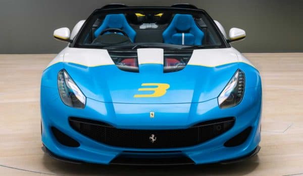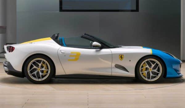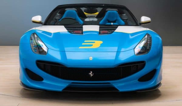 El paragolpes frontal recibe una mirada muy característica, la cual se asemeja a una amplia sonrisa. Además, las tomas de aire ahora son más pronunciadas y en el capó, encontramos dos paneles transparentes que dejan ver el motor V12 de aspiración natural con 780 CV a 8.500 rpm y 705 Nm de par motor. Aunque uno de los aspectos más destacados de este one-off es su llamativa combinación de colores en Azzurro Met y Giallo Modena.