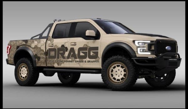 Respecto al Ford F-150 Lariat Sport SuperCrew 4×4 de Drag Racing Against Gangs & Graffiti (DRAGG), apodado como Desert Defender, cuenta con una suspensión elevada, amortiguadores Fox y llantas Fifteen52 de 20 pulgadas calzadas con neumáticos BFGoodrich All-Terrain KO2. Lo mueve un poderoso motor V8 de 5.0 litros con un sobrealimentador Ford Performance.