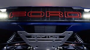 El vehículo, compuesto por una estructura de acero T45 y paneles de carrocería de fibra de carbono, combina funcionalidad con la estética Raptor característica de Ford.E