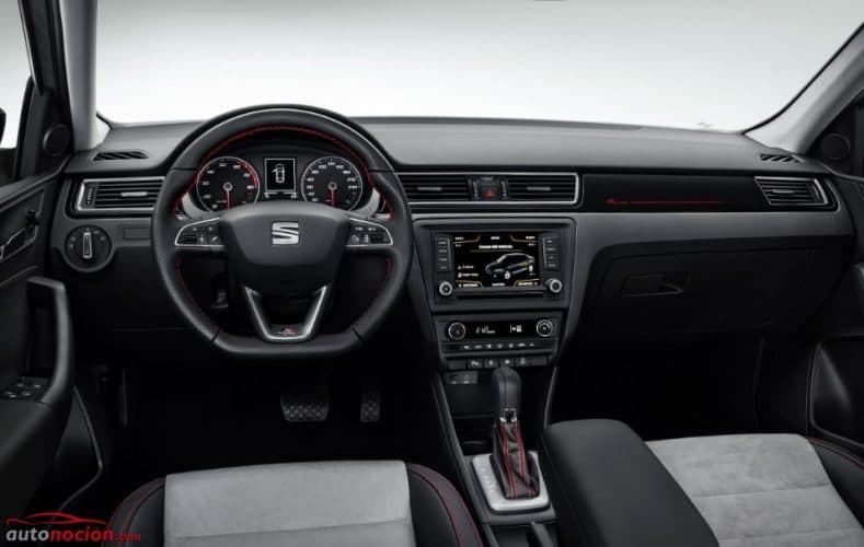 El Toledo FR Line extiende la deportividad a su interior en negro. El volante y el pomo del cambio en cuero presentan un acabado con costuras rojas, al igual que los asientos tapizados en Alcántara con laterales acolchados en símil de piel. Las alfombrillas llevan también un reborde decorativo rojo. Los guarnecidos negros brillantes del salpicadero están iluminados, y las estriberas muestran el logotipo FR Line.