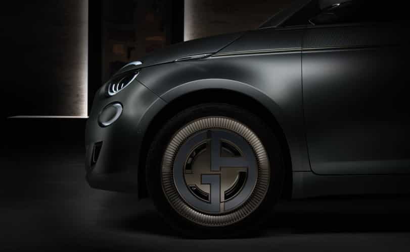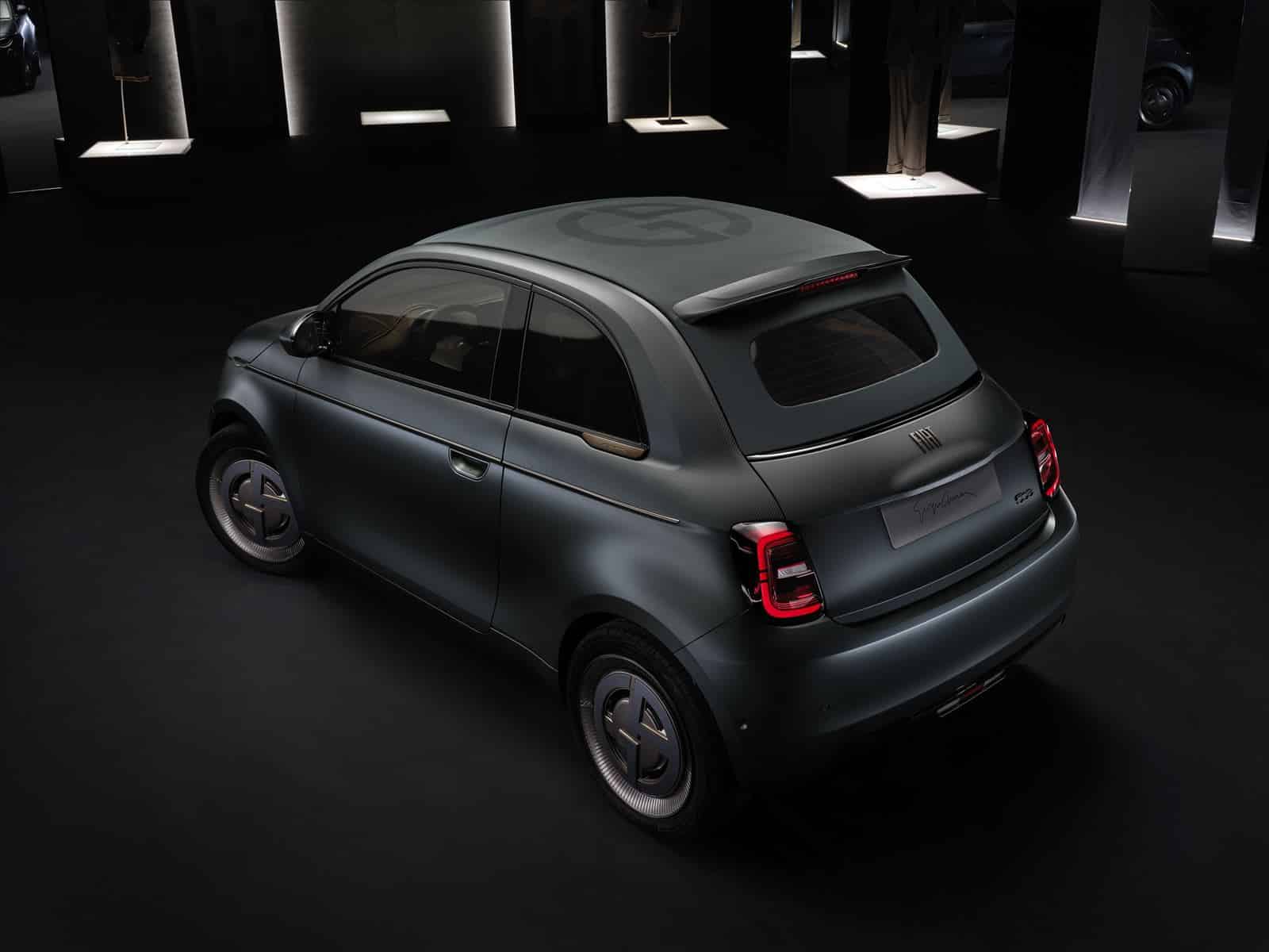 La empresa de alta costura ha interpretado su versión del 500 eléctrico, el 500 Armani, en nombre de la confección atemporal y la sostenibilidad. Utilizando tecnología láser, Armani deseaba dar forma al recubrimiento metálico de la carrocería del automóvil (y a ser posible grabarlo) con un grabado exclusivo en microchevron, para que pareciera lo más posible a las tres dimensiones de una tela. El resultado se ve reforzado por un color de «efecto seda» gris-verde Armani. Además, la pintura mate utilizada para el exterior es un producto innovador. Si bien el logotipo «GA» es una característica importante del diseño de las llantas y personaliza el tejido de la capota, las ventanillas de color ámbar elevan el nivel de armonía y sofisticación del vehículo.
