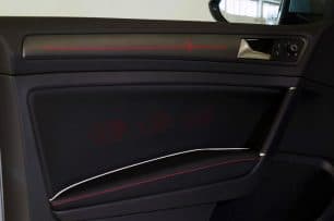 Las inserciones de las puertas del Golf GTI Heartbeat cuentan con el mismo esquema de color interior y las salidas de aire cuentan con una estructura de nido de abeja en el interior que queda totalmente visible.