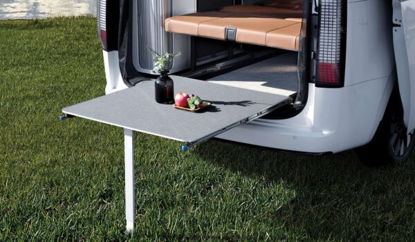Uno de los grandes protagonistas del STARIA Camper Concept es su techo elevable eléctrico, totalmente integrado en la carrocería. No es un añadido torpe ni un parche visual. Aquí todo está pensado para que, al aparcar, el coche se transforme de verdad. El interior gana altura, entra más luz y la zona de cocina se vuelve mucho más usable, sin comprometer la aerodinámica.
