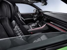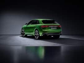 El diseño exterior del nuevo RS Q8 está hecho exclusivamente de piezas específicas de RS y es mucho más agresivo que en las variantes convencionales e incluso que en el Audi SQ8. La estructura de panal tridimensional específica de RS está acabada en negro brillante. Debajo de los faros LED, las entradas de aire laterales se abren en el nuevo y llamativo parachoques RS y se extienden hasta el borde inferior de los faros.