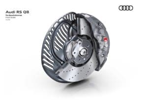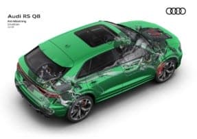 La suspensión neumática adaptativa RS con amortiguación controlada se ha ajustado específicamente para el RS Q8 y puede variar la altura en 90 mm. Se puede configurar en varios modos, incluido un control de nivelación automático. El sistema de serie permite escoger entre el máximo confort para las largas distancias o la dureza para el alto rendimiento.