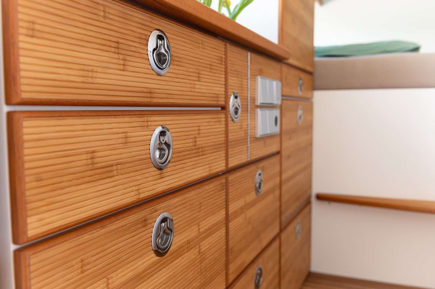 Al otro lado, el gran área de cocina cuenta con una placa de inducción de doble zona, fregadero de acero inoxidable, encimeras de teca, horno microondas, lavaplatos y refrigerador de 130 litros con congelador de 65 litros. Los cajones de almacenamiento incluyen divisores de platos antideslizantes.