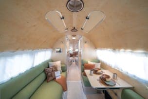 La zona de descanso incluye mantas de lino. Además de los acabados y materiales únicos, Bowlus agrega algunas características especiales a su caravana, tales como instrumentos meteorológicos para hacer un seguimiento del clima o un diario que permite a los viajeros anotar recuerdos de sus aventuras alrededor del Globo. .