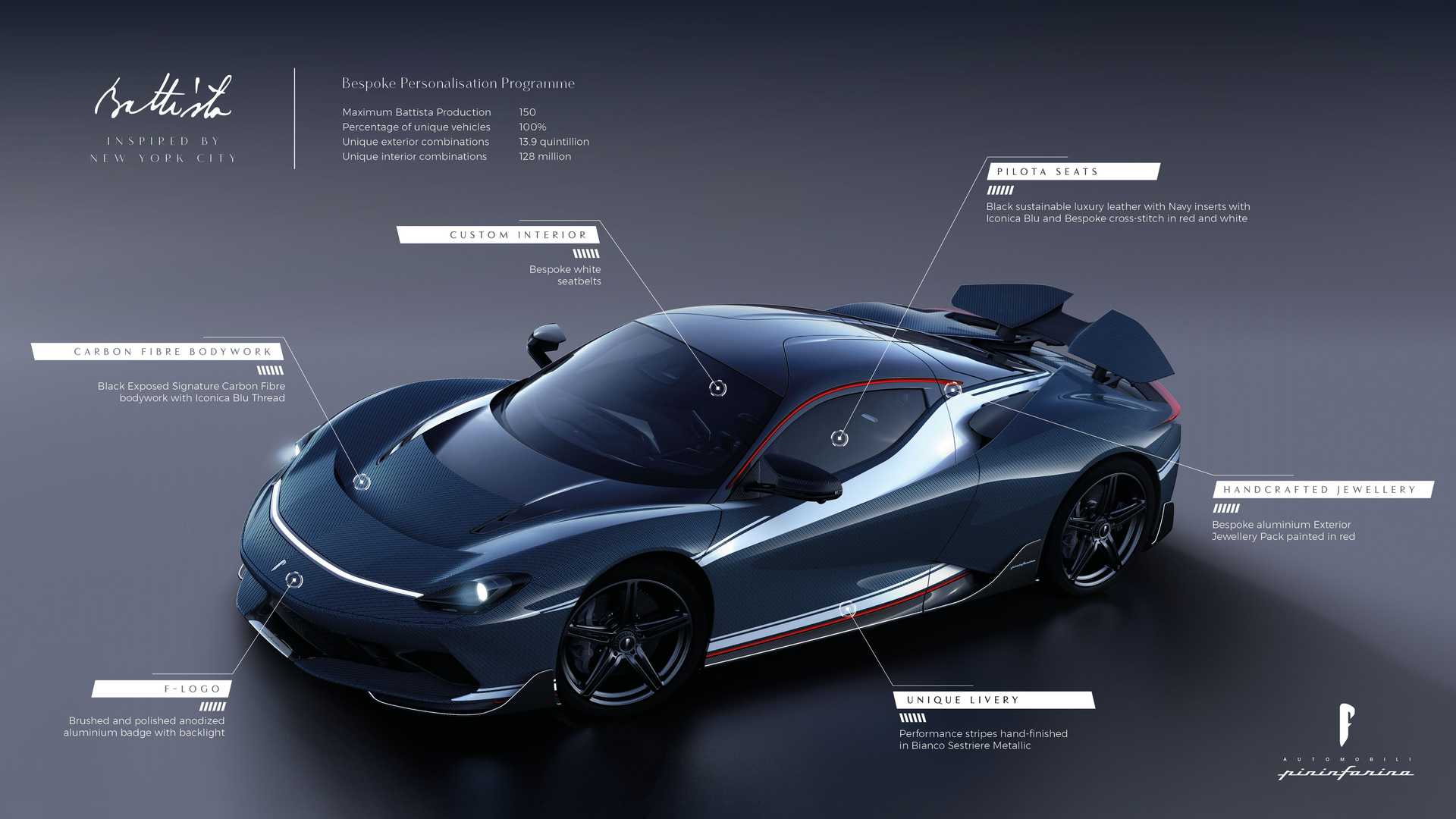 El esquema de color rojo, blanco y azul se ha creado a través del programa de personalización Bespoke de la compañía, que ofrecerá a cada uno de los 150 clientes del Battista opciones ilimitadas de personalización al diseñar su automóvil. Cada coche se construirá a mano en Pininfarina S.p.A cerca de Turín.