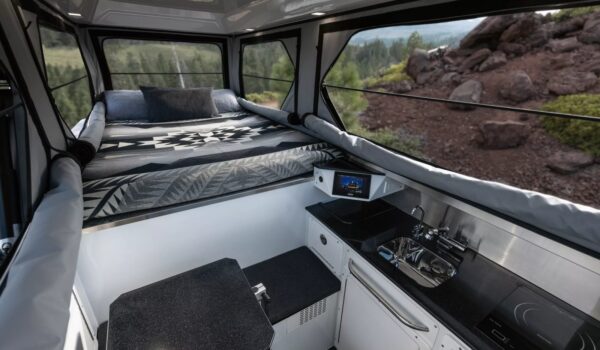 Con el techo bajado, el vehículo mide 2,29 metros de alto; mientras que cuando está completamente desplegado, la altura se eleva a 2,97 metros. Eso brinda 2,03 metros de espacio para estar de pie en la entrada, 1,93 metros en el pasillo 0,89 metros en el área de la cama. Esta equipa un colchón de tamaño completo. Además, el techo tiene un panel solar de 605 W en la parte superior.