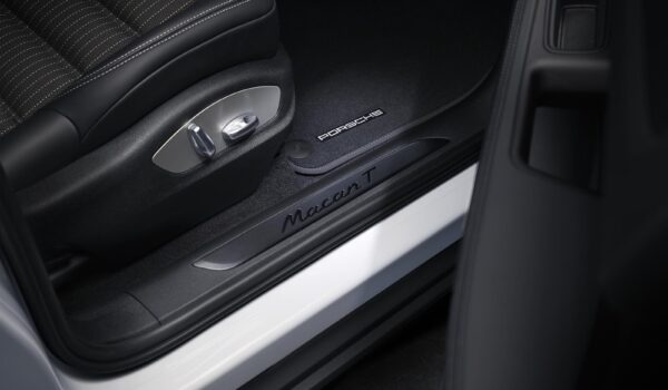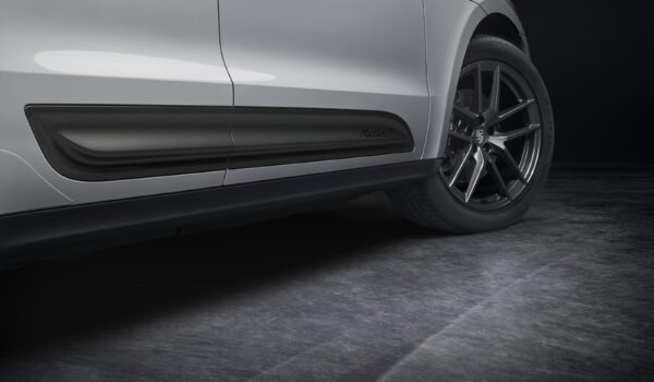 El color de contraste exclusivo se puede ver en la moldura delantera, los retrovisores exteriores, los estribos laterales, el spoiler de techo y los logotipos posteriores. Las salidas de escape deportivas y las molduras de las ventanillas en negro (alto brillo) forman parte del equipamiento de serie. El logotipo “Macan T” en los estribos también va pintado en negro.