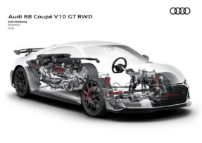 En las entrañas del R8 Coupe GT RWD 2023 descansa el motor V10 atmosférico de 5.2 litros. La gran novedad es que cuenta con las cifras del Audi R8 quattro. Esto lo convierte en el modelo de tracción trasera más potente en la historia de Audi. La potencia se envía a las ruedas traseras a través de una transmisión S tronic modificada con 7 velocidades.