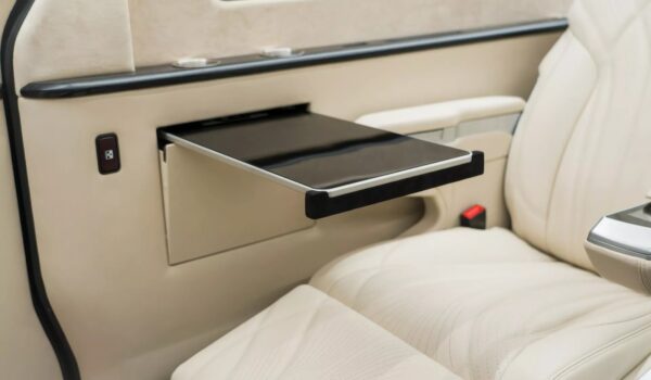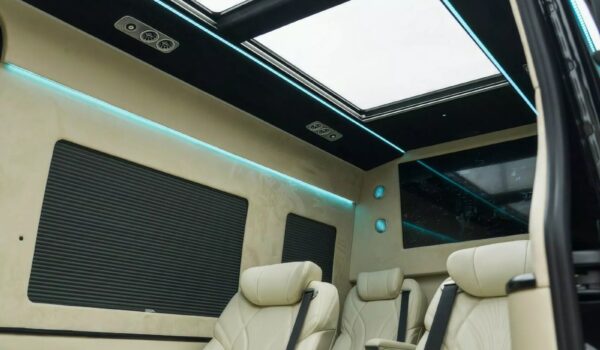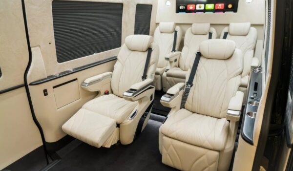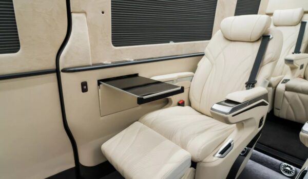 Lo que en el exterior parece un Mercedes-Benz Sprinter para pasajeros convencional, en el interior alberga espacio para siete pasajeros con unos niveles de exclusividad difíciles de igualar. Todas las plazas están revestidas de cuero personalizado con un reposapiés totalmente eléctrico, funciones de reclinación y deslizamiento, mesas, calefacción, ventilación, soporte lumbar ajustable y masajes.
