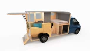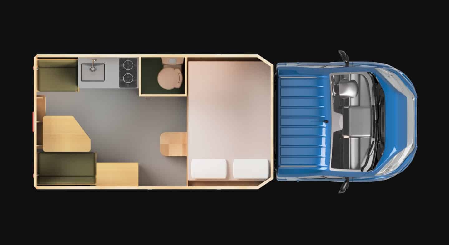 El módulo de vivienda cuenta con anclajes para fijarse a un furgón de tipo plataforma, pero suma al conjunto patas hidráulicas que le permiten convertirse en una acogedora cabaña. Además, el techo emergente lo convierte en un compacto apartamento de dos pisos.