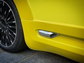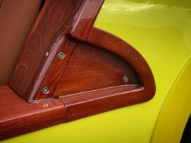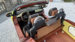 Si hay algo por lo que destaca el Tender2 es por la ausencia de puertas, techo, pilares y portón trasero. La gran protagonista es la madera de caoba Sapelli brillante que cubre las áreas recortadas, como si de un barco se tratase. El color amarillo elegido para el exterior se parece al del Abarth 500e y se combina con un tono amarillo diferente para las extensiones de la carrocería.
