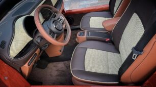 Los asientos delanteros han sido reemplazados por unos nuevos de BMW, que cuentan con cinturones de seguridad integrados. Se añade una separación detrás de ellos, con barras antivuelco para incrementar la protección en caso de accidente. Pone la guinda del pastel una nueva tapicería de ecopiel y tela náutica. Esta combina tres tonalidades diferentes: negro, marrón y crema.