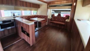 La cocina completa ofrece a los pasajeros cuatro puntos de inducción para cocinar, un gran fregadero y una combinación de refrigerador congelador de 185 litros. La sala de estar cuenta con un gran sofá y un televisor emergente de pantalla plana con un tamaño de 32 pulgadas.