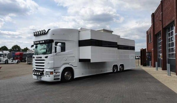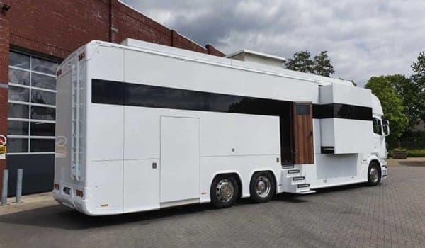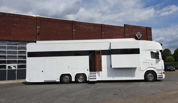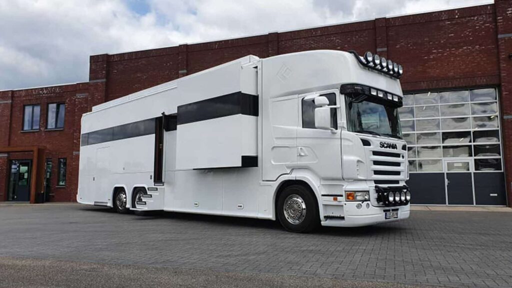 Desarrollado sobre la base de un Scania R480, estamos ante una conversión puramente europea (donde se ofrece este modelo) que lleva muchas horas de trabajo. En sus entrañas de aluminio podemos encontrar un auténtico apartamento de lujo a medida con varias habitaciones, un baño completo e incluso un garaje con un taller.