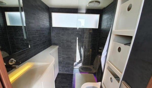 Este incluye un inodoro convencional y una gran ducha. El equipamiento estándar añade un tanque de agua dulce de 750 litros, otro de aguas grises con 420 litros de capacidad y un tercero de aguas residuales de 200 litros; calentador de agua, suelo radiante, generador diésel, lavadora y secadora.