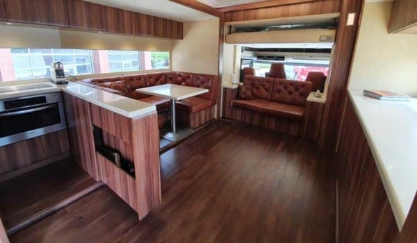 La cocina completa ofrece a los pasajeros cuatro puntos de inducción para cocinar, un gran fregadero y una combinación de refrigerador congelador de 185 litros. La sala de estar cuenta con un gran sofá y un televisor emergente de pantalla plana con un tamaño de 32 pulgadas.