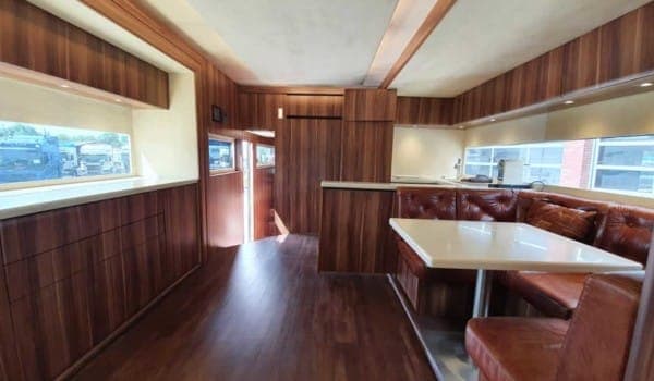 Además, mantiene el pequeño dormitorio original instalado en la cabina del Scania, lo que aporta un dormitorio adicional al apartamento posterior. Respecto a este último, destacan especialmente las dos superficies deslizables que dan vida a la cocina y la sala de estar, aportando elevadas dosis de espacio para la vida a bordo.