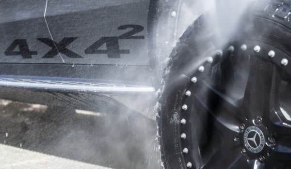 Esta se combina con un juego de neumáticos off road en dimensiones 285/50 R 20 para ambos ejes, los cuales se integran en unos pasos de rueda ensanchados en 200 milímetros y respaldados por protecciones plásticas que aportan al EQC un aspecto de ‘Big Foot’. Con todo ello, presume de una capacidad de vadeo de 400 mm.