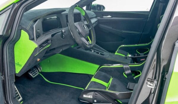 El interior sigue un esquema de color similar al exterior. Se puede apreciar una tapicería en Alcantara negra y verde con costuras a contraste. El conductor y el pasajero delantero se sientan en unos asientos de carreras de fibra de carbono con arneses firmados por Recaro. El banco trasero se ha quitado para reducir el peso y se ha reemplazado por una jaula antivuelco.