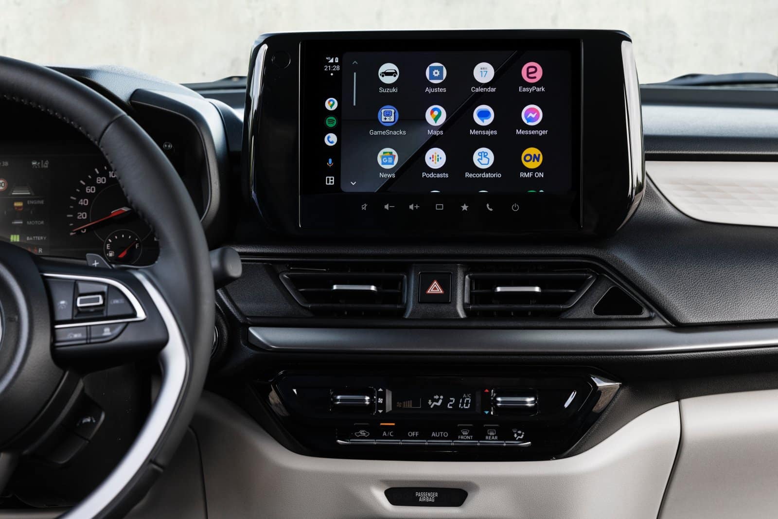 Otras novedades interesantes son los mandos de climatización y la situación del botón de arranque junto a la puerta. La instrumentación, por su parte, mantiene los dos diales analógicos. Al mismo tiempo, mejora notablemente el equipamiento de seguridad. Suzuki nos habla de asistente de mantenimiento de carril, monitorización del conductor, frenada de emergencia con detección de vehículos, peatones y ciclistas…