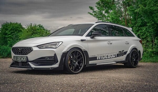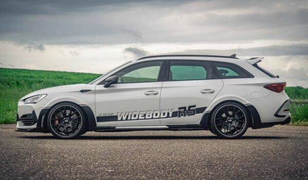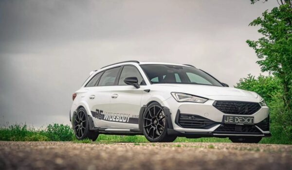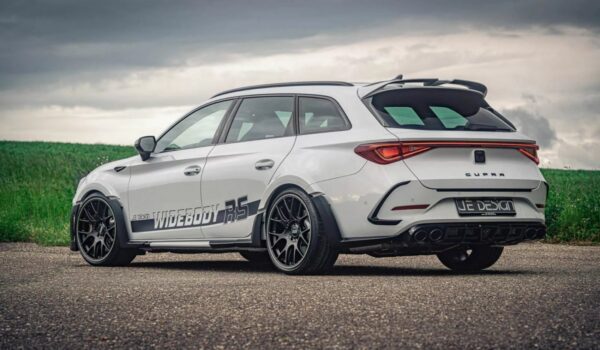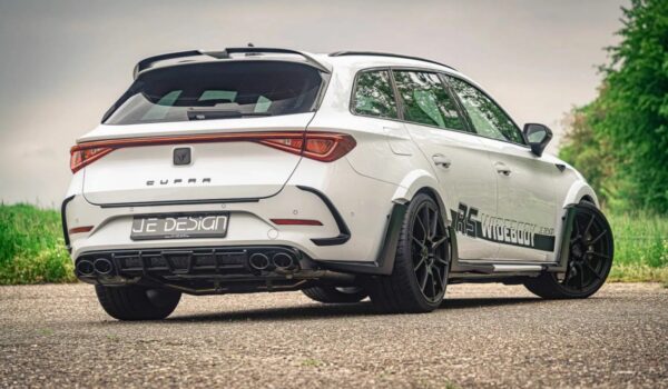 La versión de tracción total más potente del CUPRA León, que está disponible exclusivamente en la carrocería familiar, recibe el paquete Widebody RS de JE Design para llevar un paso más allá la deportiva carrocería del compacto. Además, cuenta con mejoras mecánicas que elevan su potencia por encima de rivales como el Volkswagen Golf R o el Audi S3.