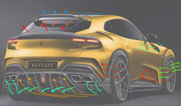 Gracias al trabajo del especialista tendremos un Ferrari Purosangue mucho más agresivo que el convencional. Keyvany ha añadido un nuevo capó ventilado, así como un paragolpes delantero rediseñado con ventilaciones adicionales que ensanchan la figura del modelo. El perfil presenta extensiones de guardabarros, con un par de branquias laterales y aletas adicionales en los faldones laterales.