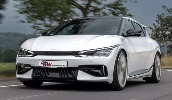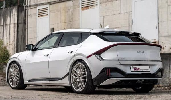 Asimismo, permiten rebajar la altura del EV6 GT entre 20 y 45 mm. Según la compañía, estos amortiguadores roscados V3 ayudan a suavizar y amortiguar la marcha, al tiempo que garantizan que los neumáticos mantengan niveles óptimos de agarre. Y hablando de neumáticos, estos calzan unas nuevas llantas BBS CC-R Unlimited de 22 pulgadas con acabado en oro blanco.