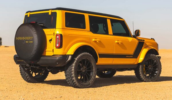 Este Manhart BC 400, del cual solo se ensamblarán 10 unidades, destaca desde el primer vistazo. A juego con las mejoras mecánicas podemos ver un exterior más agresivo. Tomando como base la variante Badlands, el BC 400 recibe guardabarros acabados en amarillo brillante a juego con el resto de la carrocería, en un lugar de los paneles negros originales.